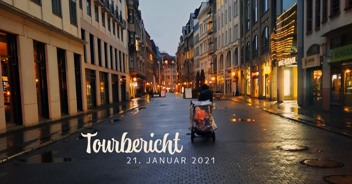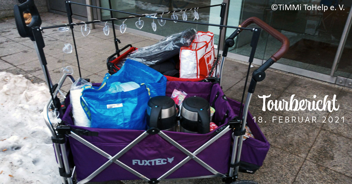 Donnerstag, 11.02.2021 – Tourbericht Projekt Care Bags Heute geht’s für uns raus in die Kälte und durch den Schnee. Wir hatten wie erwartet an einigen Stellen Probleme mit unseren Bollerwägen durchzukommen. Das war heute eine ziemlich anstrengende Tour für uns. Besonders da wir aufgrund der aktuellen Situation nur zu zweit sein