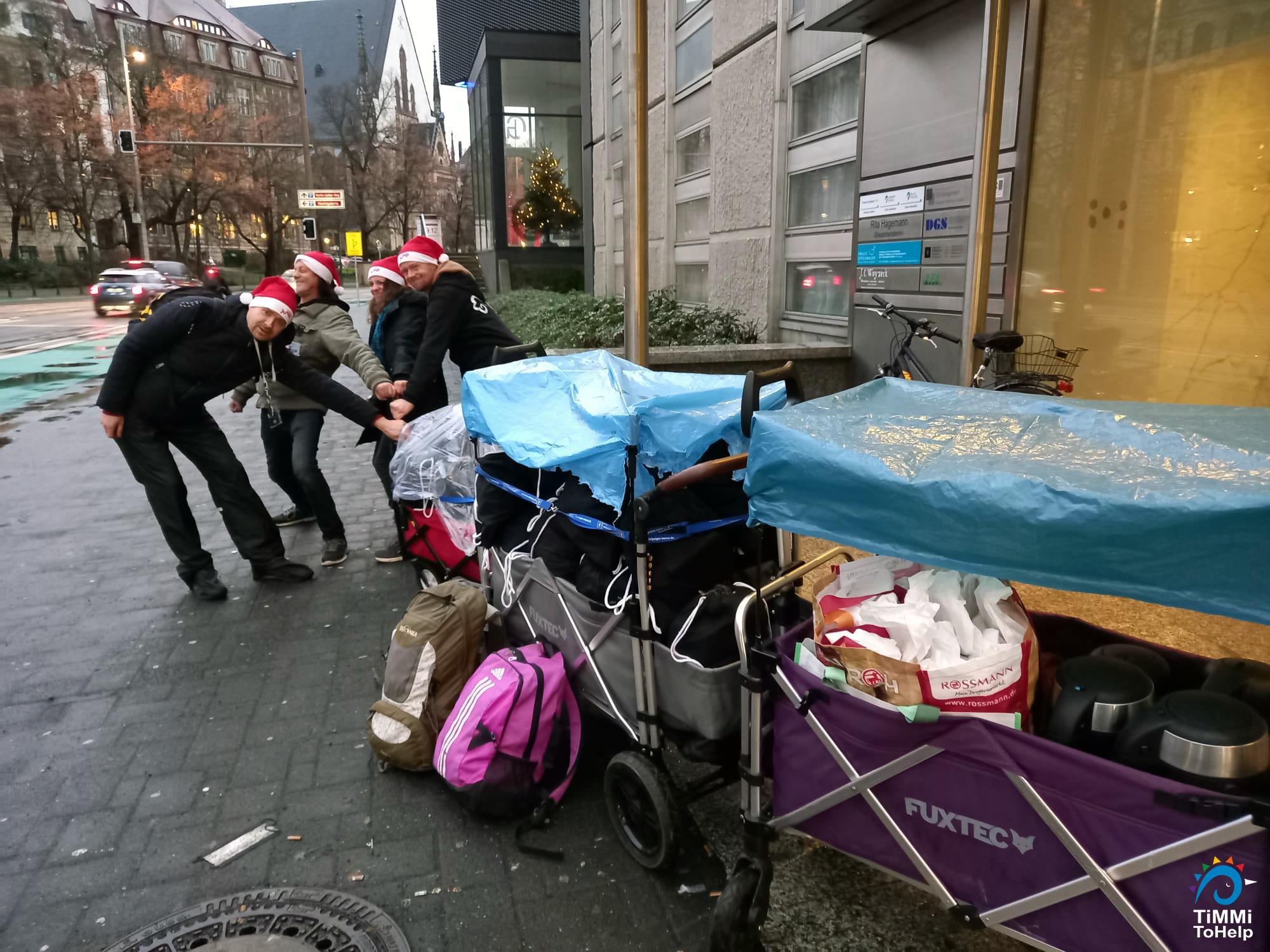 Mit drei Bollerwagen und zusätzlich drei Rucksäcken voller Plätzchentüten geht es für uns los. Auf zur Weihnachtsrunde!